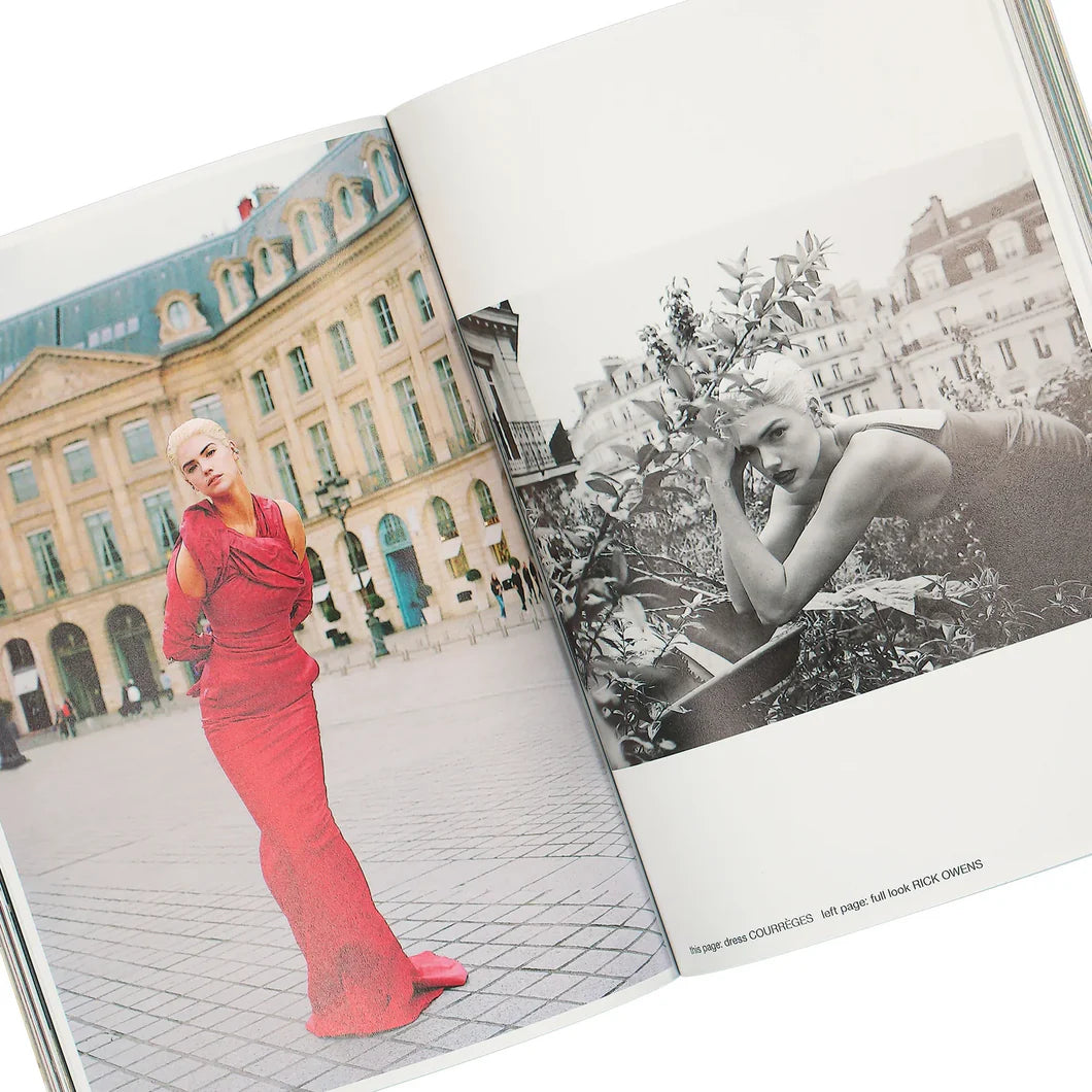 Yet, there is also light. An otherworldly one emanates from Petra Collins and Helena Tejedor’s shoot of ROSALÍA, which is rhetorically embellished with nonfiction by Heather McCalden. Harmony Korine/EDGLRD lets THE WEEKND motorcycle in a GTA-esque, computer-generated world of ghosts, and ABEL TESFAYE chats with his younger self in the form of custom-programmed ChatGPT mediated by Ross Scarano. VARG²™ welcomes Shane Anderson into his world of wolves while Raphael Bliss captures the Swedish producer in a swamp at night. LUKA SABBAT tells Claire Koron Elat why he has a guillotine at his dinner table and Nicolas Wagner and Ras Bartram capture the existentialist in one of his hometowns, Paris. Also in the French capital, KATE UPTON slurps margaritas in bed with Sebastián Faena and Ras Bartram. The photographer-stylist duo also visits a farm where LOLI BAHIA shows us what the world wants. Phillip Pyle ventures into the cavities of artist MIRE LEE’s ugliness, formlessness, and stupidity, and BRYAN JOHNSON tells Dagmar Von Taube and Sven Michaelsen how to stay alive forever with approximately 100 pills a day. Hendrik Schneider and Tim Heyduck explore the identity of chrome, JENS BALZER uncovers the necessity of cultural appropriation together with Shane Anderson, and Max von Gumppenberg was seen backstage taking shots at our first runway show in Paris by MARIA KOCH.